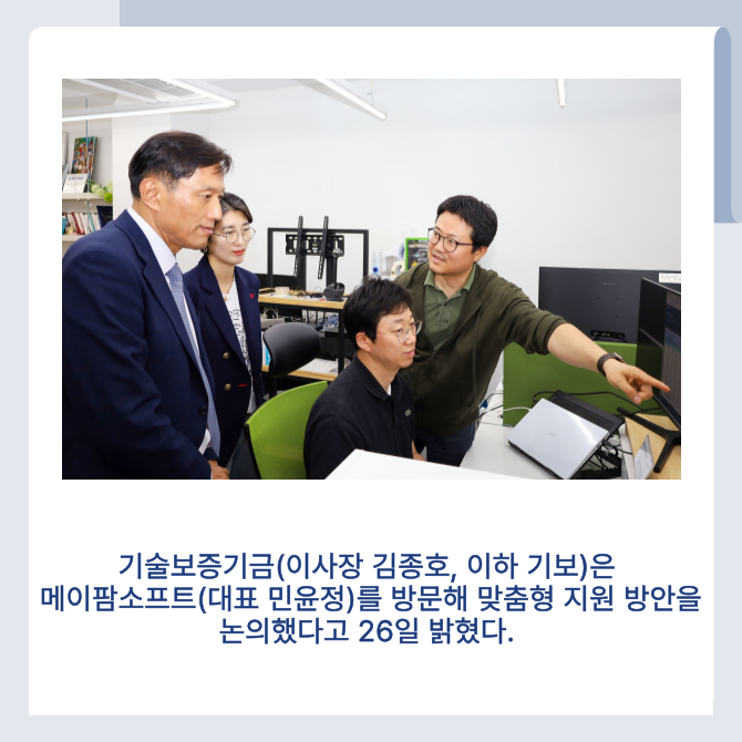 [프라임경제] 기술보증기금(이사장 김종호, 이하 기보)은 인공지능 기업 메이팜소프트(대표 민윤정)를 방문해 맞춤형 지원 방안을 논의했다고 26일 밝혔다.