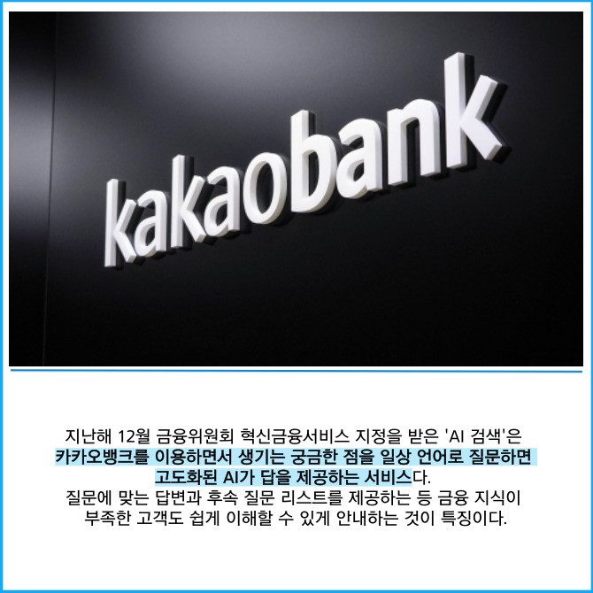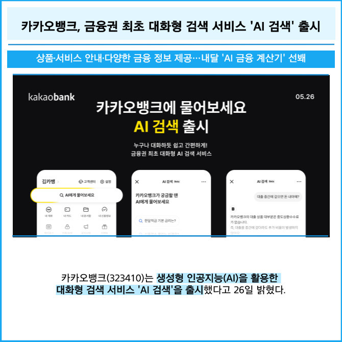 [프라임경제] 카카오뱅크(323410)는 생성형 인공지능(AI)을 활용한 대화형 검색 서비스 'AI 검색'을 출시했다고 26일 밝혔다.