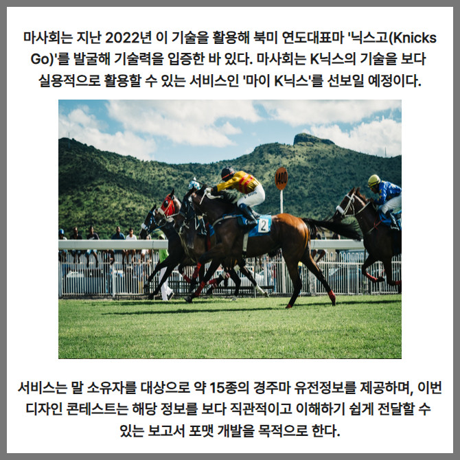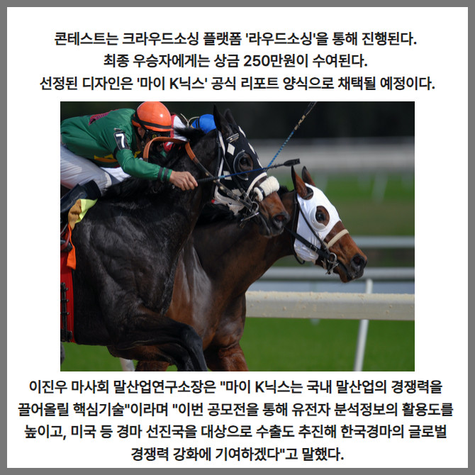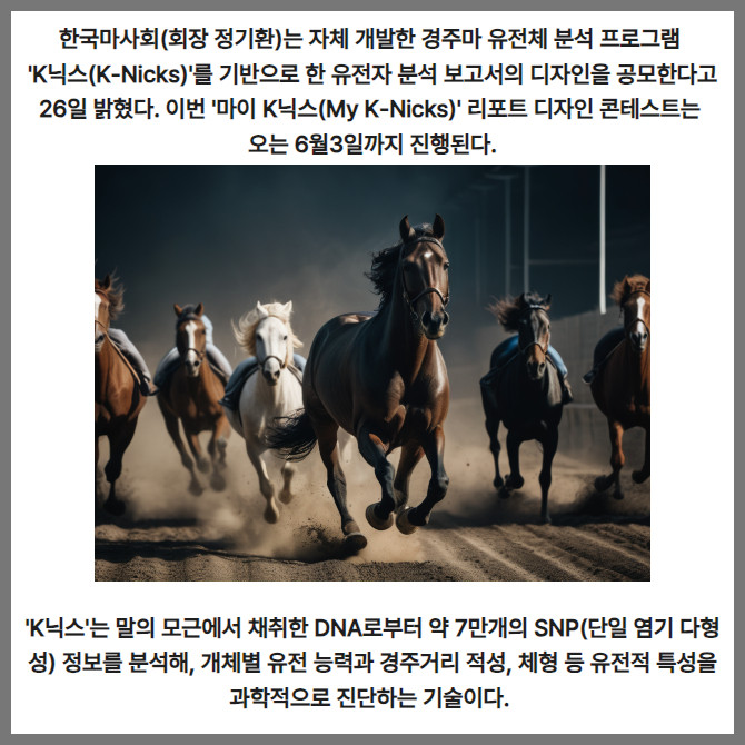 [프라임경제] 한국마사회(회장 정기환)는 자체 개발한 경주마 유전체 분석 프로그램 'K닉스(K-Nicks)'를 기반으로 한 유전자 분석 보고서의 디자인을 공모한다고 26일 밝혔다.