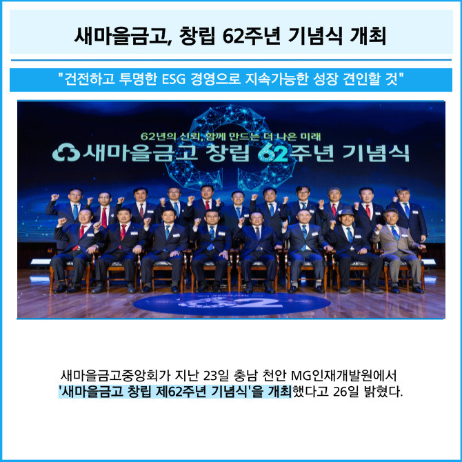 [프라임경제] 새마을금고중앙회가 지난 23일 충남 천안 MG인재개발원에서 '새마을금고 창립 제62주년 기념식'을 개최했다고 26일 밝혔다.
