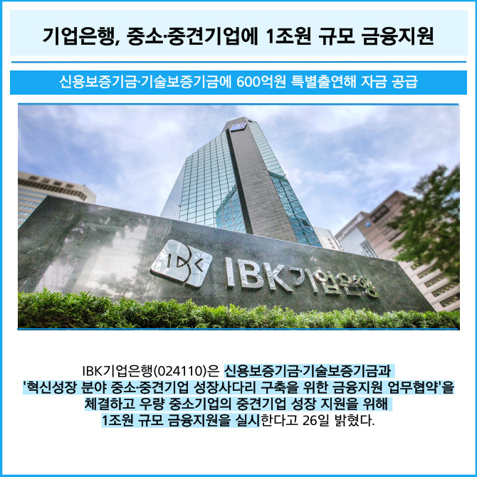 [프라임경제] IBK기업은행(024110)은 신용보증기금·기술보증기금과 '혁신성장 분야 중소·중견기업 성장사다리 구축을 위한 금융지원 업무협약'을 체결하고 우량 중소기업의 중견기업 성장 지원을 위해 1조원 규모 금융지원을 실시한다고 26일 밝혔다.