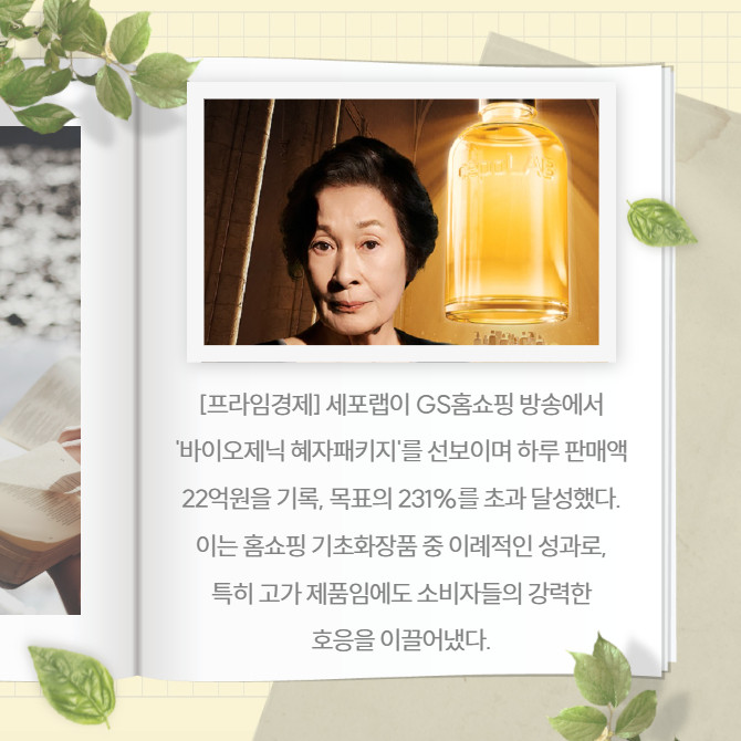 [프라임경제] 세포랩이 GS홈쇼핑 방송에서 '바이오제닉 혜자패키지'를 선보이며 하루 판매액 22억원을 기록, 목표의 231%를 초과 달성했다. 이는 홈쇼핑 기초화장품 중 이례적인 성과로, 특히 고가 제품임에도 소비자들의 강력한 호응을 이끌어냈다.