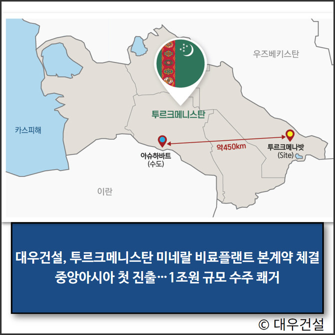 이번 수주를 통해 대우건설은 신규 시장인 투르크메니스탄을 비롯해 중앙아시아 지역에 첫 진출하는 쾌거를 이뤘다. 투르크메니스탄은 풍부한 자원을 바탕으로 높은 성장 잠재력을 보유한 국가로, 현지 시장을 적극 개척해 석유화학 및 비료관련 사업의 추가 수주를 모색할 뿐만 아니라 인프라, 신도시개발 참여 등 다양한 분야에서도 신규사업 발굴을 확대할 수 있게 됐다.