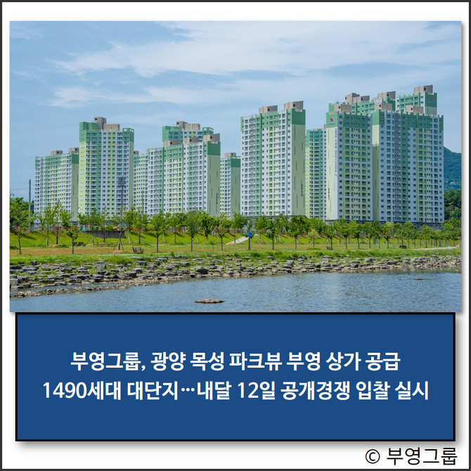 광양 목성 파크뷰 부영 1·2단지 상가는 다음달 12일 공개경쟁 입찰을 실시하며, 13일 계약을 진행한다. 입찰 및 계약 장소는 광양 목성 파크뷰 부영 모델하우스다.