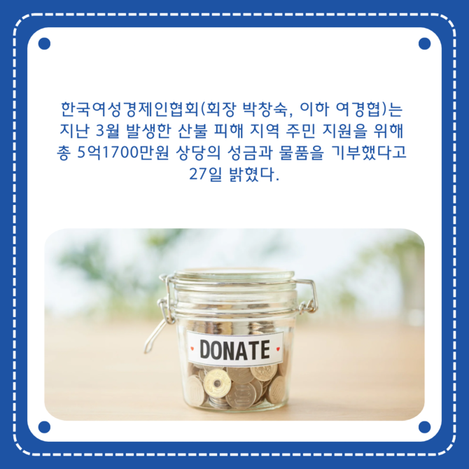 [프라임경제] 한국여성경제인협회(회장 박창숙, 이하 여경협)는 지난 3월 발생한 산불 피해 지역 주민 지원을 위해 총 5억1700만원 상당의 성금과 물품을 기부했다고 27일 밝혔다.