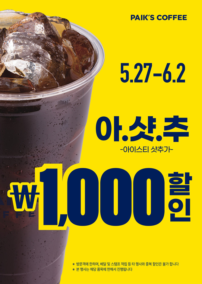 단, 아이스 카페라떼와 아메리카노 할인 프로모션의 경우, 행사 혼잡도를 고려해 대용량인 '빽사이즈'에는 적용되지 않으며, 옵션 추가나 메뉴 변경 등도 불가하다. 이번 프로모션은 일부 매장을 제외한 전국 빽다방 매장에서 진행된다.