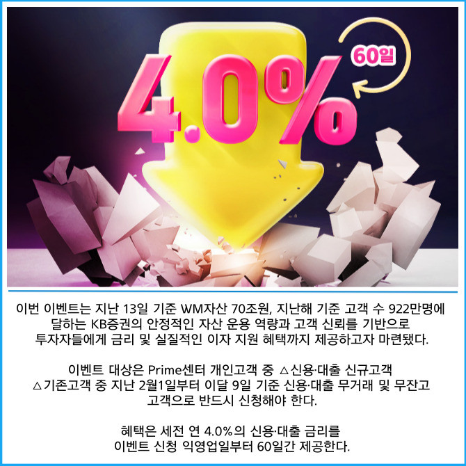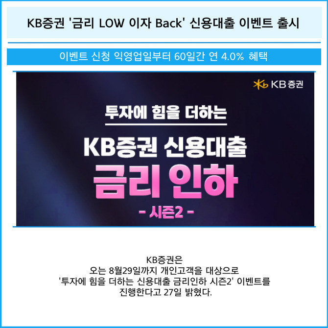[프라임경제] KB증권은 오는 8월29일까지 개인고객을 대상으로 '투자에 힘을 더하는 신용대출 금리인하 시즌2' 이벤트를 진행한다고 27일 밝혔다.