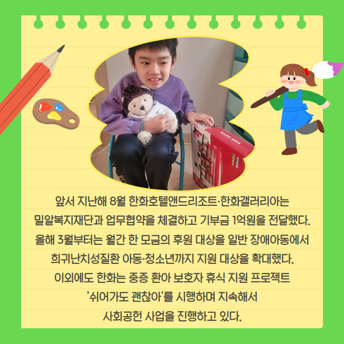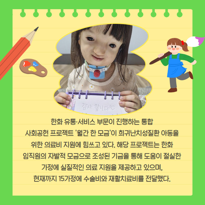 [프라임경제] 한화 유통·서비스 부문이 진행하는 통합 사회공헌 프로젝트 '월간 한 모금'이 희귀난치성질환 아동을 위한 의료비 지원에 힘쓰고 있다. 해당 프로젝트는 한화 임직원의 자발적 모금으로 조성된 기금을 통해 도움이 절실한 가정에 실질적인 의료 지원을 제공하고 있으며, 현재까지 15가정에 수술비와 재활치료비를 전달했다.