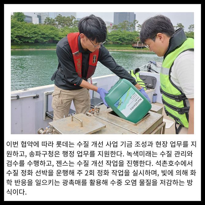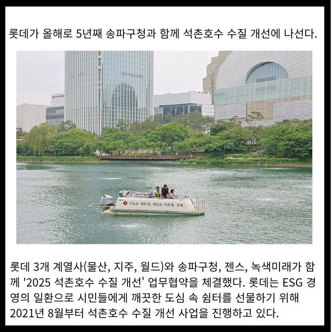 롯데 3개 계열사(물산, 지주, 월드)와 송파구청, 젠스, 녹색미래가 함께 '2025 석촌호수 수질 개선' 업무협약을 체결했다. 롯데는 ESG 경영의 일환으로 시민들에게 깨끗한 도심 속 쉼터를 선물하기 위해 2021년 8월부터 석촌호수 수질 개선 사업을 진행하고 있다.