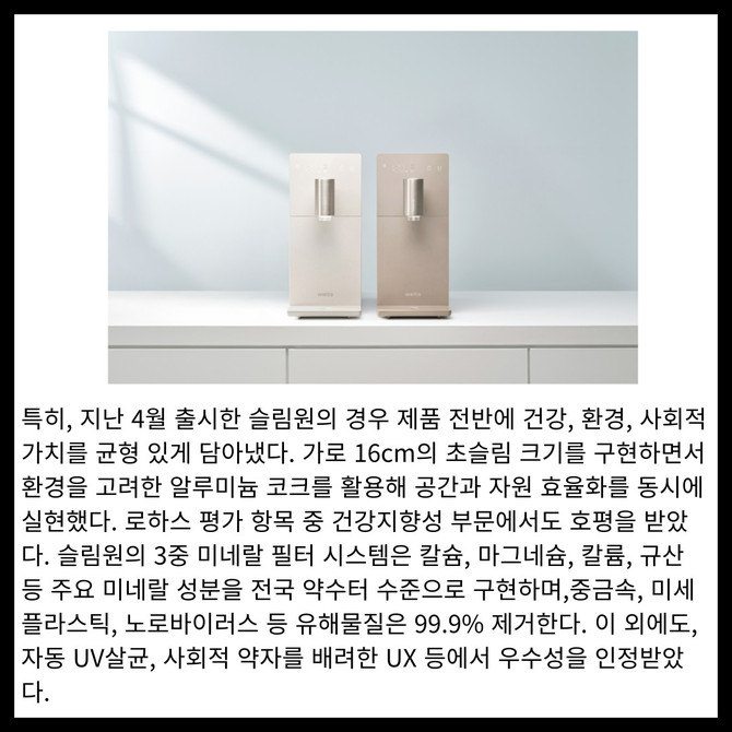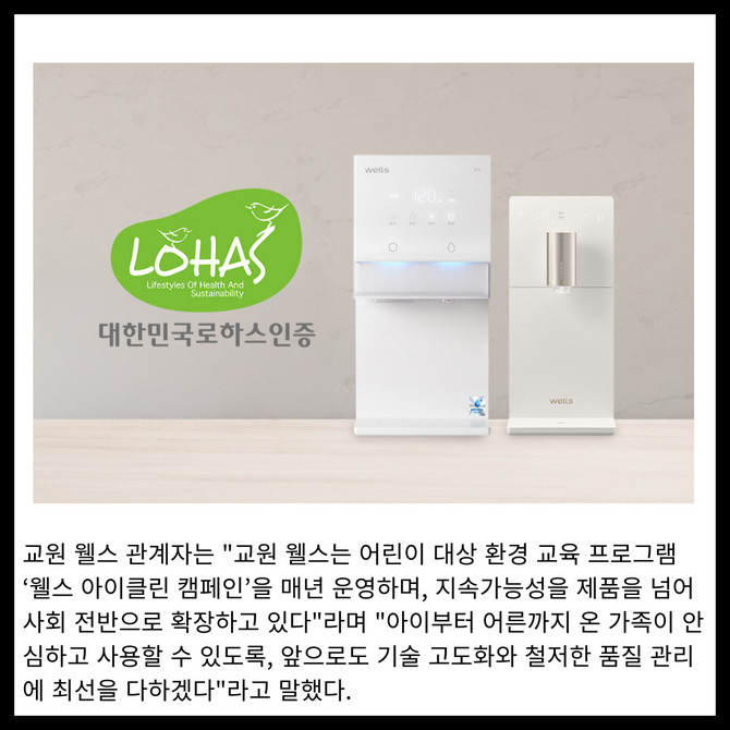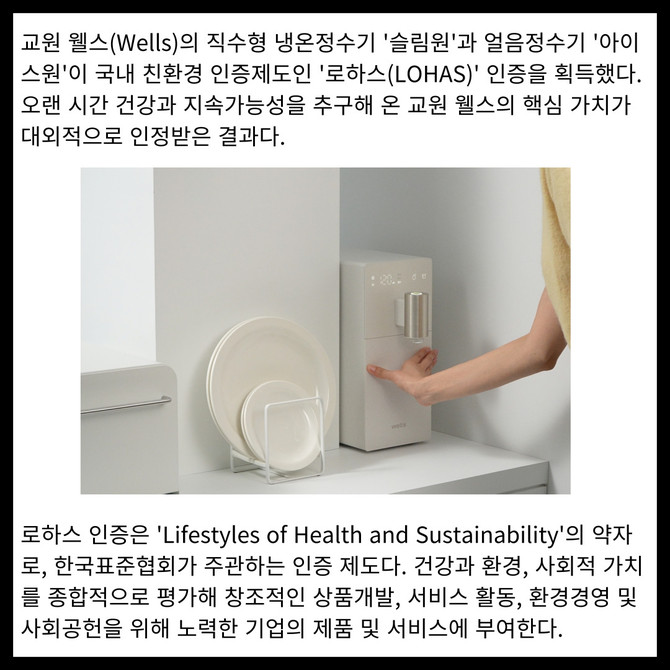 [프라임경제] 교원 웰스(Wells)의 직수형 냉온정수기 '슬림원'과 얼음정수기 '아이스원'이 국내 친환경 인증제도인 '로하스(LOHAS)' 인증을 획득했다. 오랜 시간 건강과 지속가능성을 추구해 온 교원 웰스의 핵심 가치가 대외적으로 인정받은 결과다.