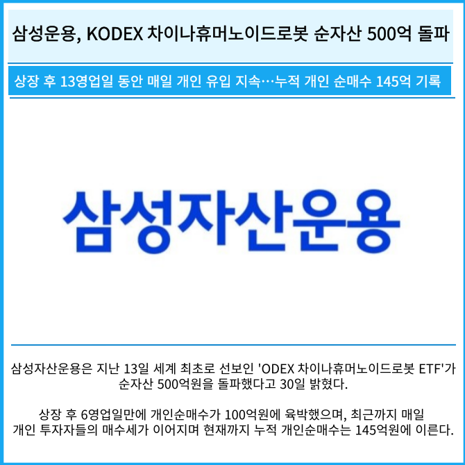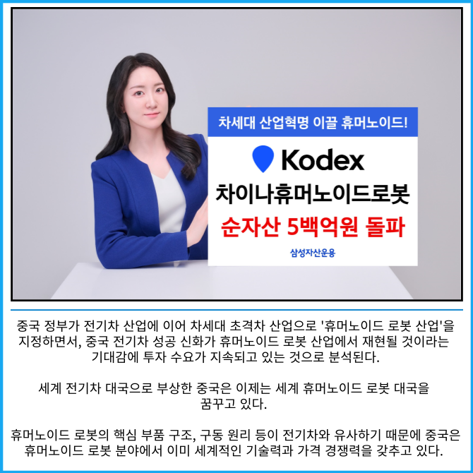 [카드 ]삼성운용, KODEX 차이나휴머노이드로봇 순자산 500억 돌파