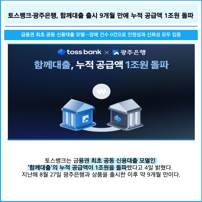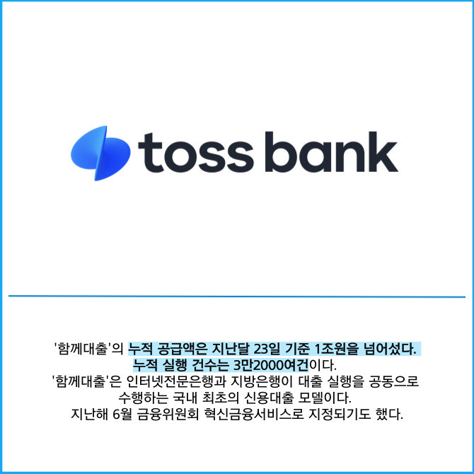 [프라임경제] 토스뱅크는 금융권 최초 공동 신용대출 모델인 '함께대출'의 누적 공급액이 1조원을 돌파했다고 4일 밝혔다. 지난해 8월 27일 광주은행과 상품을 출시한 이후 약 9개월 만이다.