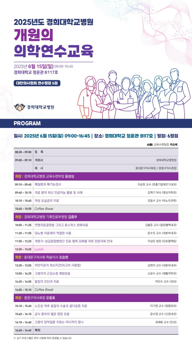 경희대학교병원은 6월15일, 오전 9시부터 경희대학교 청운관에서 '2025 개원의 의학연수교육'을 개최한다.