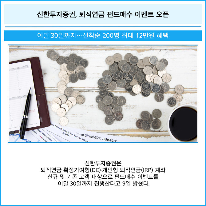 [프라임경제] 신한투자증권은 퇴직연금 확정기여형(DC)·개인형 퇴직연금(IRP) 계좌 신규 및 기존 고객 대상으로 펀드매수 이벤트를 이달 30일까지 진행한다고 9일 밝혔다.