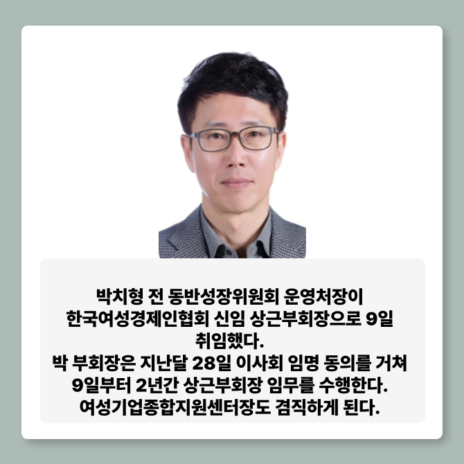 [프라임경제] 박치형 전 동반성장위원회 운영처장이 한국여성경제인협회 신임 상근부회장으로 9일 취임했다.