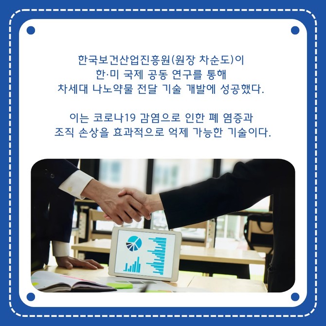 [프라임경제] 한국보건산업진흥원(원장 차순도)이 한·미 국제 공동 연구를 통해 차세대 나노약물 전달 기술 개발에 성공했다. 이는 코로나19 감염으로 인한 폐 염증과 조직 손상을 효과적으로 억제 가능한 기술이다.