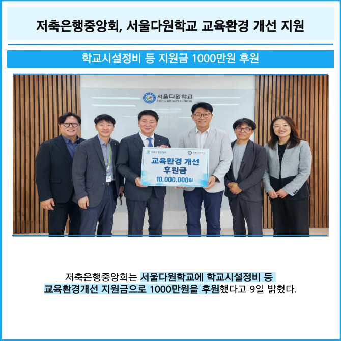 [프라임경제] 저축은행중앙회는 서울다원학교에 학교시설정비 등 교육환경개선 지원금으로 1000만원을 후원했다고 9일 밝혔다.