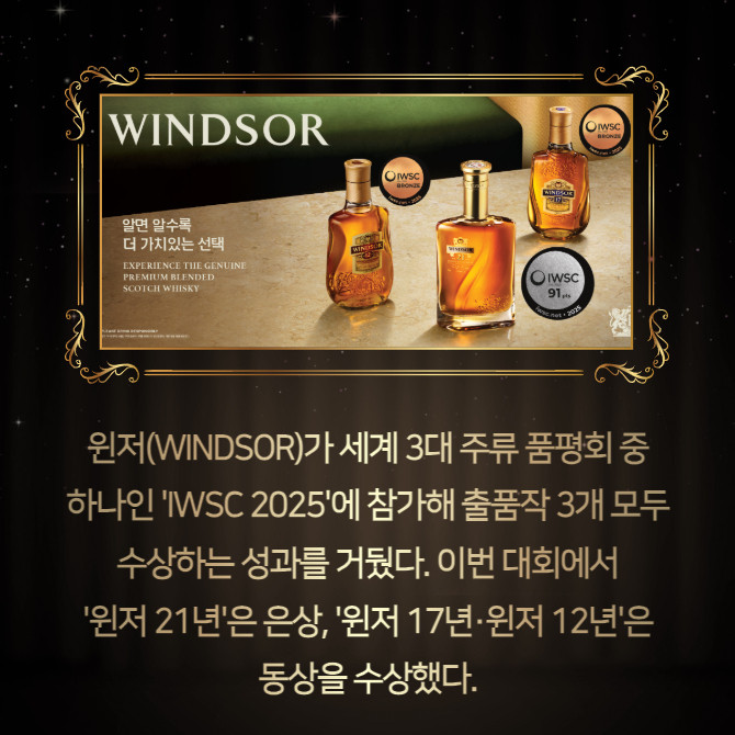[프라임경제] 윈저(WINDSOR)가 세계 3대 주류 품평회 중 하나인 'IWSC 2025'에 참가해 출품작 3개 모두 수상하는 성과를 거뒀다. 이번 대회에서 '윈저 21년'은 은상, '윈저 17년·윈저 12년'은 동상을 수상했다.