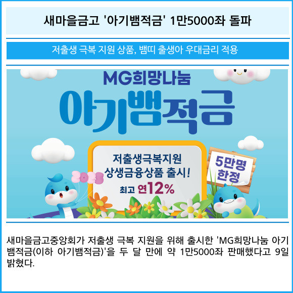 [프라임경제] 새마을금고중앙회가 저출생 극복 지원을 위해 출시한 'MG희망나눔 아기뱀적금(이하 아기뱀적금)'을 두 달 만에 약 1만5000좌 판매했다고 9일 밝혔다.