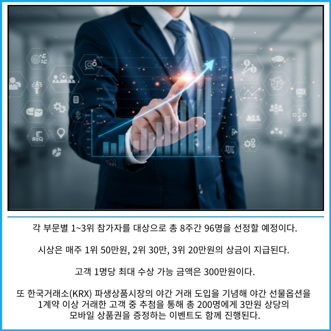 이 대회는 국내선물옵션 계좌를 보유한 고객이라면 누구나 참가할 수 있고 총 8주간 진행된다.