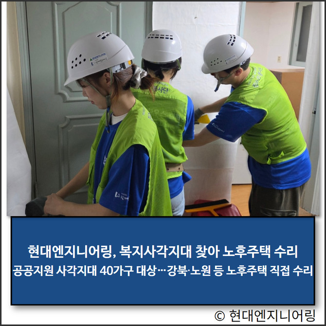 현대엔지니어링은 임직원 37명, 대학생 160명, 전문 기술자 40명 등 총 237명으로 구성된 집수리 봉사단을 운영해 6월 한 달 동안 매주 토요일마다 서울 지역 노후주택 40가구를 대상으로 봉사활동을 진행한다. 지난 7일에는 강북구·노원구·도봉구의 노후주택 10가구를 방문해 벽지 도배, 장판 시공, 싱크대·화장실 타일 교체, LED등 설치 등의 작업을 수행했다.