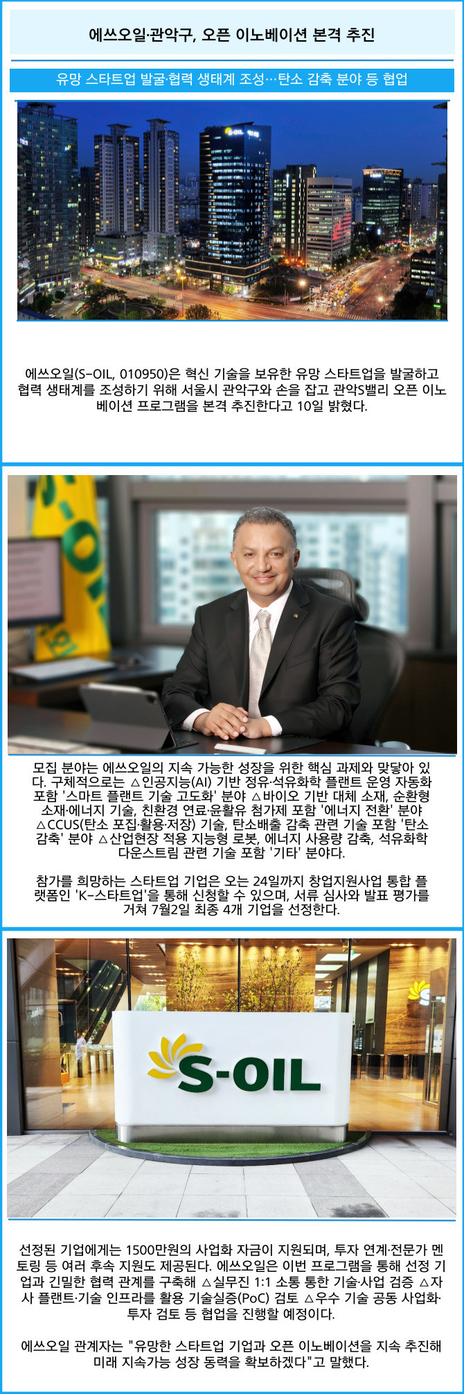 [프라임경제] 에쓰오일(S-OIL, 010950)은 혁신 기술을 보유한 유망 스타트업을 발굴하고 협력 생태계를 조성하기 위해 서울시 관악구와 손을 잡고 관악S밸리 오픈 이노베이션 프로그램을 본격 추진한다고 10일 밝혔다.
