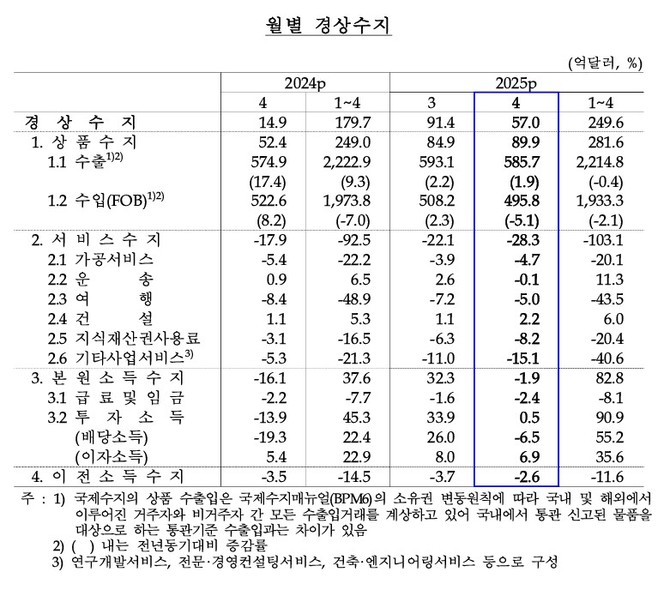 한국은행(이하 한은)이 10일 발표한 '2025년 4월 국제수지(잠정)'에 따르면 지난 4월 우리나라 경상수지는 57억달러를 기록했다.