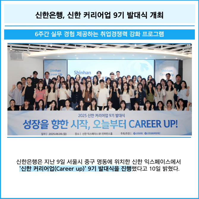 [프라임경제] 신한은행은 지난 9일 서울시 중구 명동에 위치한 신한 익스페이스에서 '신한 커리어업(Career up)' 9기 발대식을 진행했다고 10일 밝혔다.