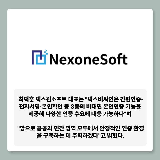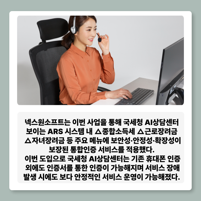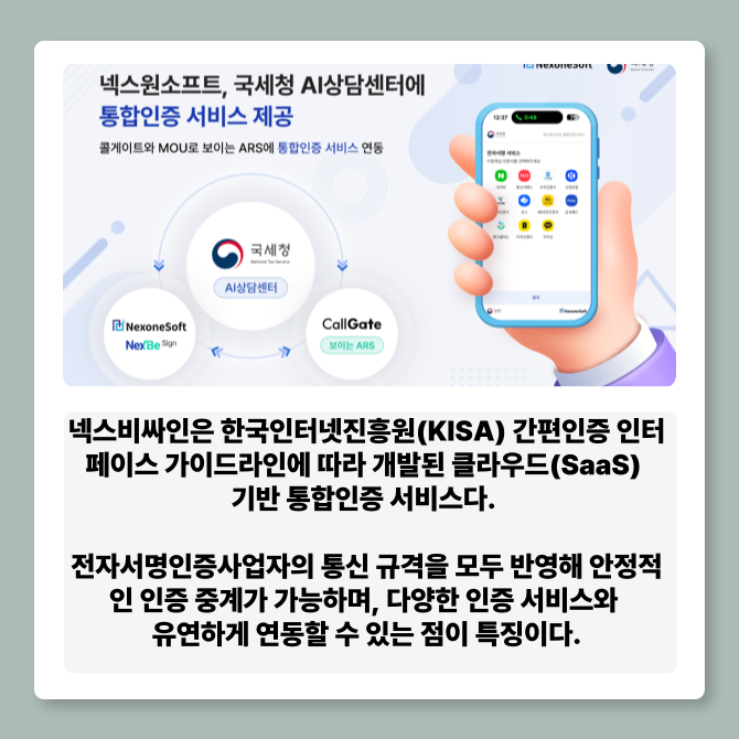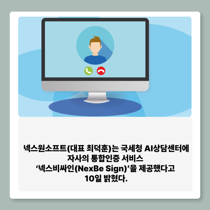 [프라임경제] 넥스원소프트(대표 최덕훈)는 국세청 AI상담센터에 자사의 통합인증 서비스 '넥스비싸인(NexBe Sign)'을 제공했다고 10일 밝혔다.