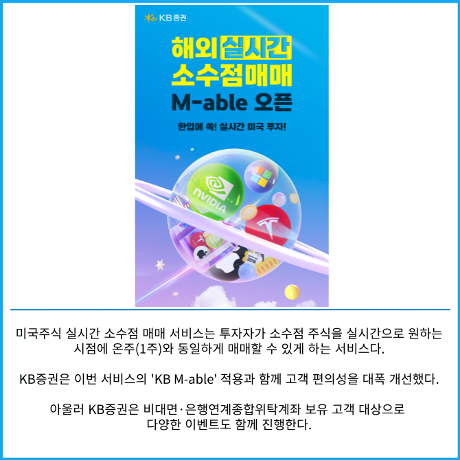 이번 서비스는 지난해 7월 'M-able미니' 및 'M-able와이드'를 통해 도입된 실시간 미국주식 소수점 매매 기능을 'KB M-able(마블)'앱까지 확대 적용한 것이다.