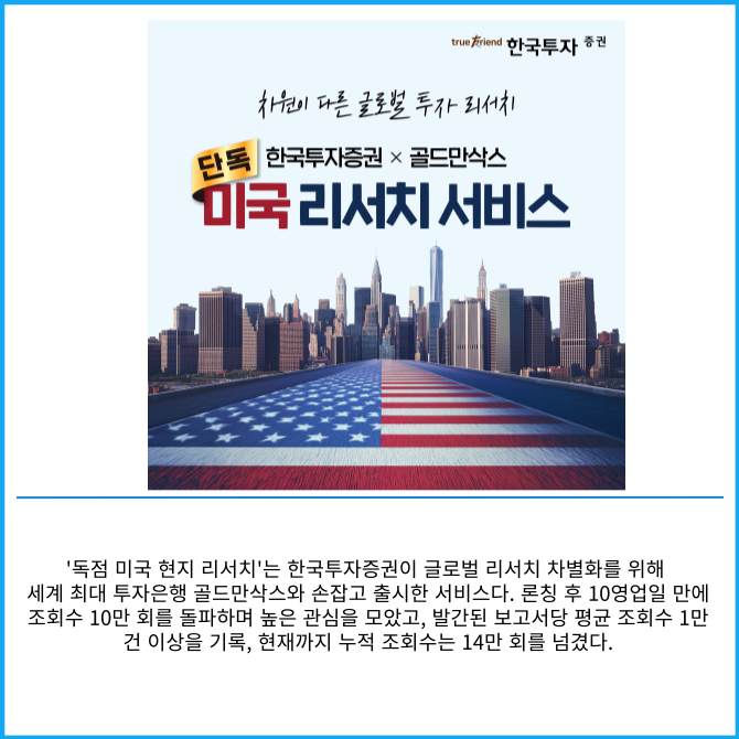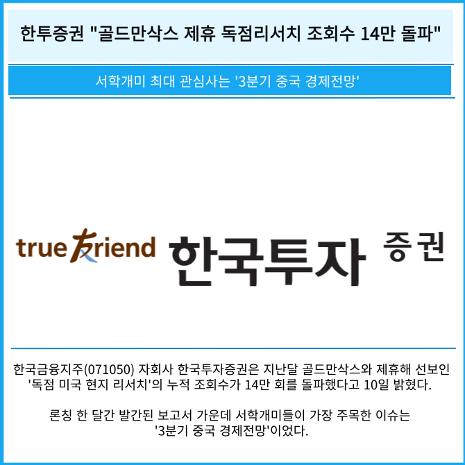 한투증권 "골드만삭스 제휴 독점리서치 누적 조회수 14만 돌파"