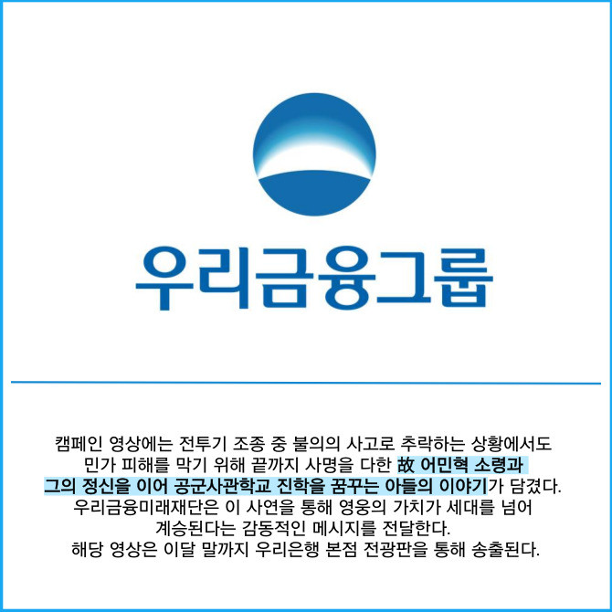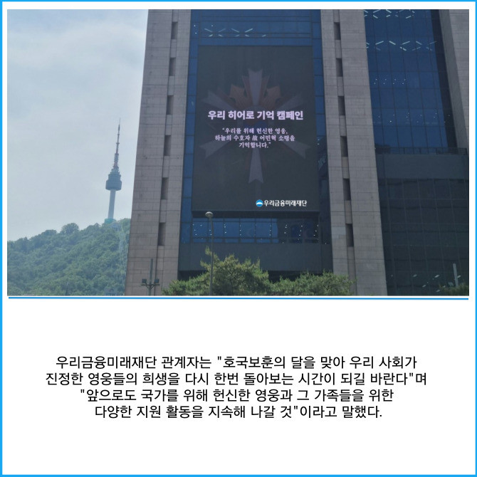 [프라임경제] 우리금융그룹(316140) 우리금융미래재단은 호국보훈의 달을 맞아 순직·공상 군인, 경찰, 소방 공무원의 숭고한 희생을 기억하고 예우하기 위한 '2025 우리 히어로 기억캠페인'을 전개한다고 10일 밝혔다.