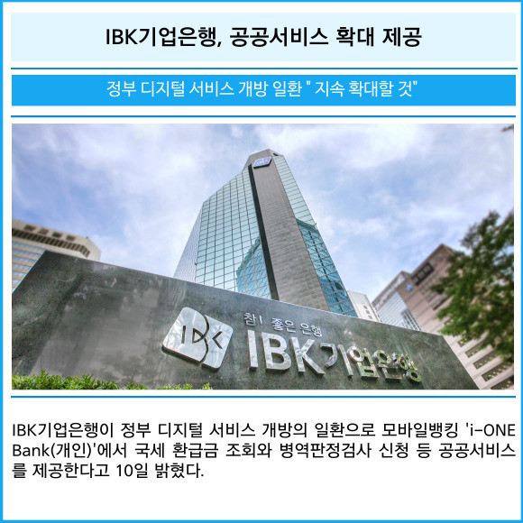 [프라임경제] IBK기업은행(024110)이 정부 디지털 서비스 개방의 일환으로 모바일뱅킹 'i-ONE Bank(개인)'에서 국세 환급금 조회와 병역판정검사 신청 등 공공서비스를 제공한다고 10일 밝혔다.