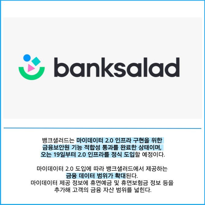 [프라임경제] 뱅크샐러드는 '마이데이터 2.0' 시행에 따라 고도화된 마이데이터 인프라를 구축한다고 11일 밝혔다.