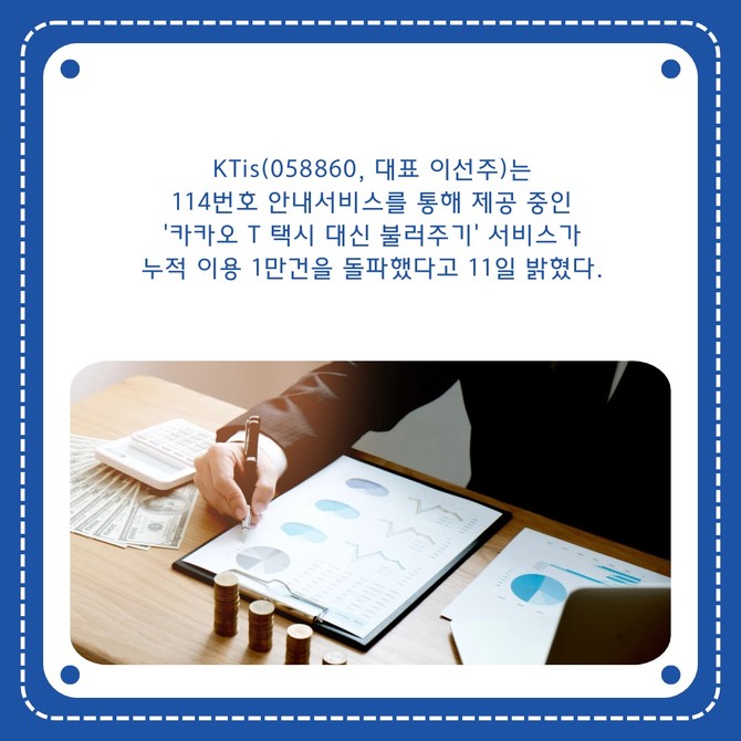[프라임경제] KTis(058860, 대표 이선주)는 114번호 안내서비스를 통해 제공 중인 '카카오 T 택시 대신 불러주기' 서비스가 누적 이용 1만건을 돌파했다고 11일 밝혔다.
