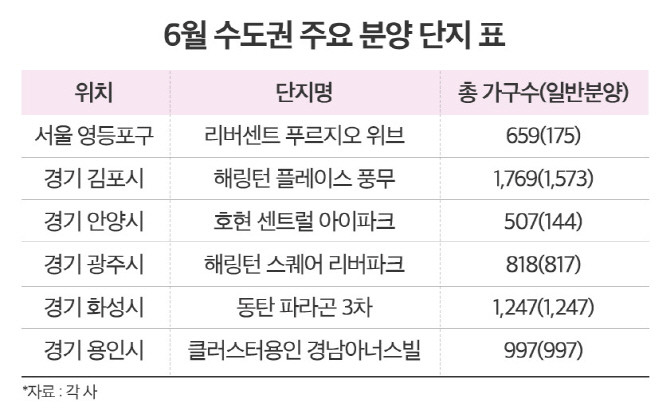 부동산시장 분석업체 부동산인포에 따르면, 6월 말까지 전국에서 일반분양 물량 1만7077가구가 추가로 풀릴 예정이다(임대 제외, 기 오픈 제외). 권역별로는 서울‧수도권(7527가구)이 가장 많으며 △지방 광역시 5447가구 △그 외 지방 4103가구로 조사됐다.