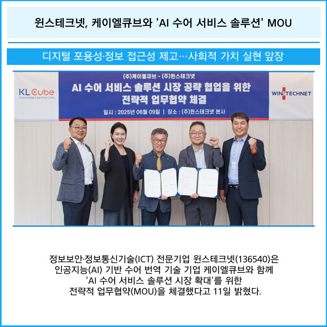 [프라임경제] 정보보안·정보통신기술(ICT) 전문기업 윈스테크넷(136540)은 인공지능(AI) 기반 수어 번역 기술 기업 케이엘큐브와 함께 'AI 수어 서비스 솔루션 시장 확대'를 위한 전략적 업무협약(MOU)을 체결했다고 11일 밝혔다.