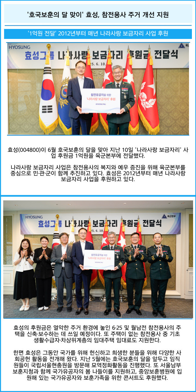 [프라임경제] 효성(004800)이 6월 호국보훈의 달을 맞아 지난 10일 '나라사랑 보금자리' 사업 후원금 1억원을 육군본부에 전달했다.