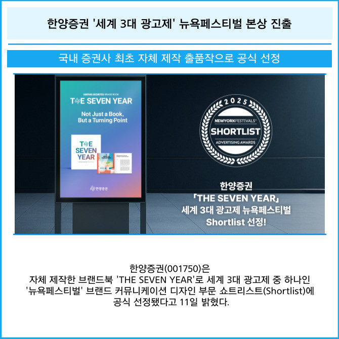 [프라임경제] 한양증권(001750)은 자체 제작한 브랜드북 'THE SEVEN YEAR'로 세계 3대 광고제 중 하나인 '뉴욕페스티벌' 브랜드 커뮤니케이션 디자인 부문 쇼트리스트(Shortlist)에 공식 선정됐다고 11일 밝혔다.