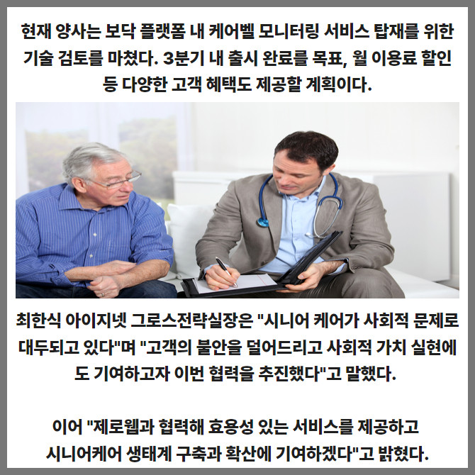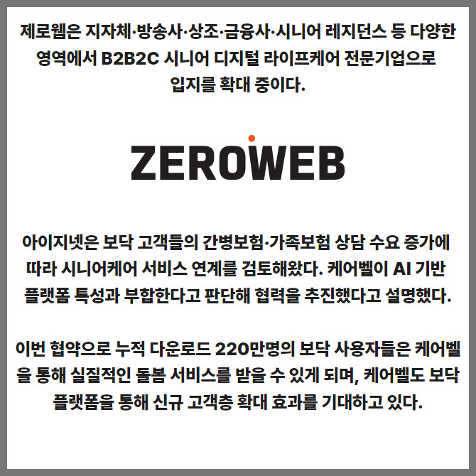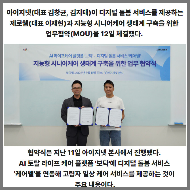 [프라임경제] 아이지넷(462980)이 디지털 돌봄 서비스 기업 제로웹과 지능형 시니어케어 생태계 구축에 나선다. 양사는 이를 위한 업무협약(MOU)을 12일 체결했다.