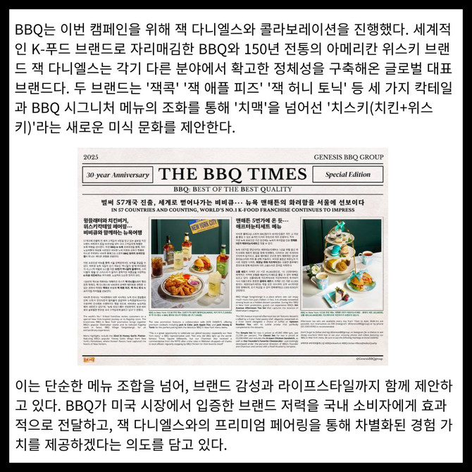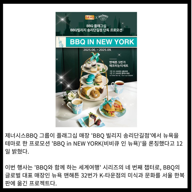 [프라임경제] 제너시스BBQ 그룹이 플래그십 매장 'BBQ 빌리지 송리단길점'에서 뉴욕을 테마로 한 프로모션 'BBQ in NEW YORK(비비큐 인 뉴욕)'을 론칭했다고 밝혔다.