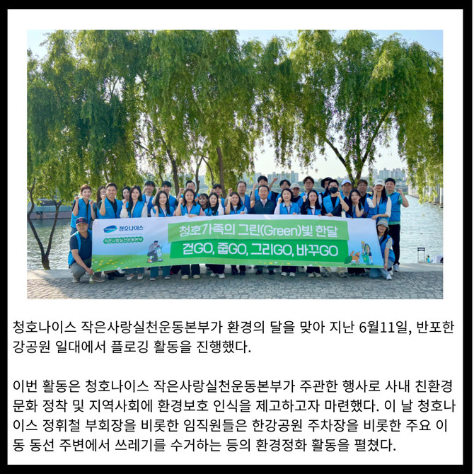 [프라임경제] 청호나이스 작은사랑실천운동본부가 환경의 달을 맞아 지난 6월11일, 반포한강공원 일대에서 플로깅 활동을 진행했다.
