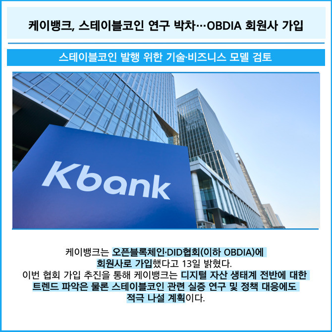 [프라임경제] 케이뱅크는 오픈블록체인·DID협회(이하 OBDIA)에 회원사로 가입했다고 13일 밝혔다. 이번 협회 가입 추진을 통해 케이뱅크는 디지털 자산 생태계 전반에 대한 트렌드 파악은 물론 스테이블코인 관련 실증 연구 및 정책 대응에도 적극 나설 계획이다.