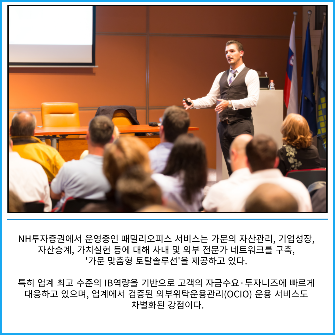 NH투자증권 패밀리오피스 세미나는 예탁자산 100억원 이상 패밀리오피스 서비스 가입 고객 중 소수의 고객만을 초청해 프라이빗 세미나로 진행한다.