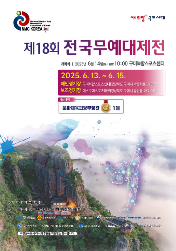 이번 대회는 한국무예총연합회(회장 장효선, 사무총장 김승, 사무차장 강상호)가 주최·주관하고, 문화체육관광부와 경상북도, 구미시, 구미시소상공인연합회, 국민체육진흥공단 후원으로 진행된다.