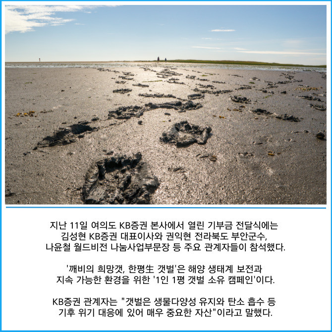 [프라임경제] KB증권은 '깨비의 희망갯, 한평生 갯벌' 임직원 기부 프로젝트를 통해 모아진 기부금 2000만원을 월드비전에 전달했다고 13일 밝혔다.