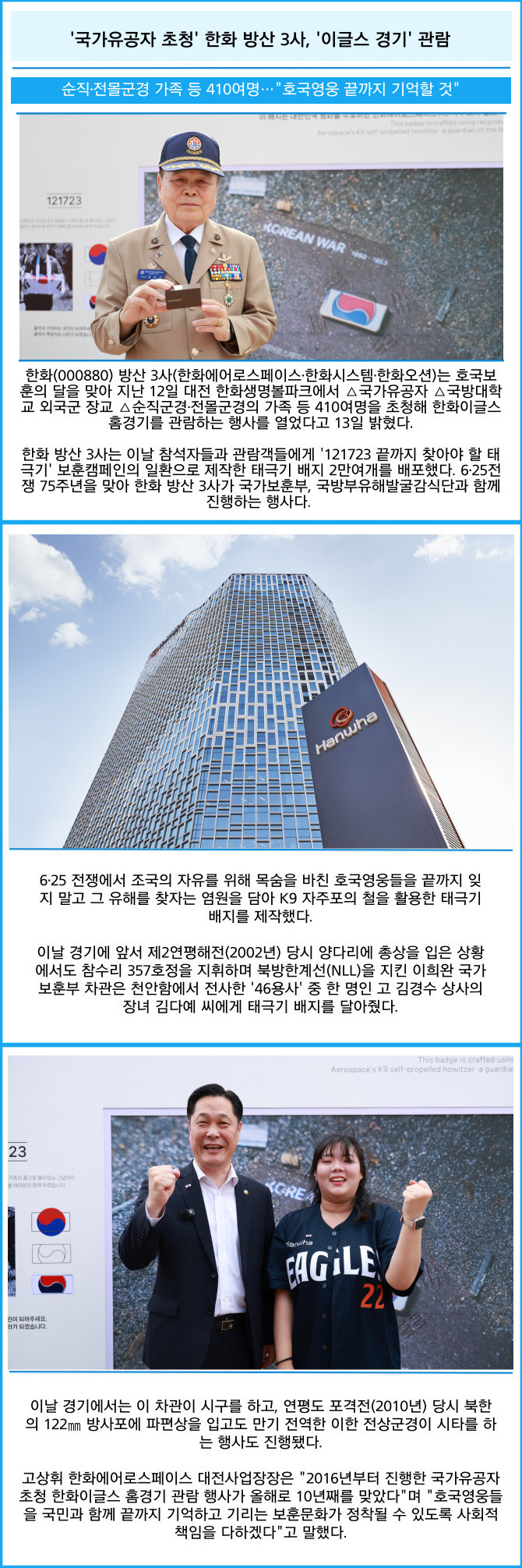 [프라임경제] 한화(000880) 방산 3사(한화에어로스페이스·한화시스템·한화오션)는 호국보훈의 달을 맞아 지난 12일 대전 한화생명볼파크에서 △국가유공자 △국방대학교 외국군 장교 △순직군경·전몰군경의 가족 등 410여명을 초청해 한화이글스 홈경기를 관람하는 행사를 열었다고 13일 밝혔다.
