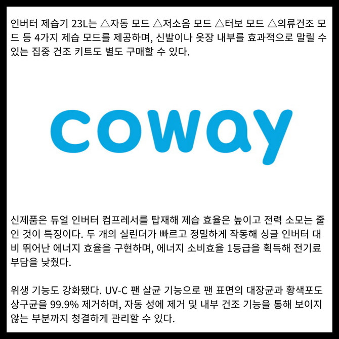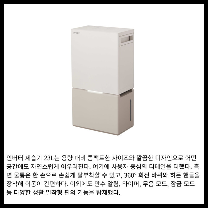 [프라임경제] 코웨이가 강력한 제습 속도와 용량으로 쾌적한 실내 환경을 제공하는 '인버터 제습기 23L(AD-2325C)'를 출시했다.