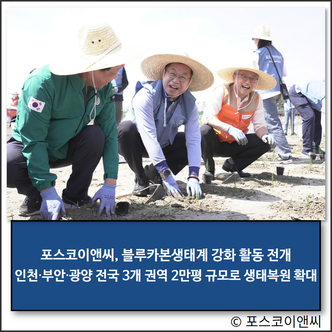 2022년부터 블루카본 생태계 복원 사업을 추진해 온 포스코이앤씨는 선재도 갯벌에서 시범 파종을 시작해지난해 10월에는 인천 영종도 폐염전과 전북 부안 줄포만 갯벌에 각각 1만평 규모의 복원을 완료했다.