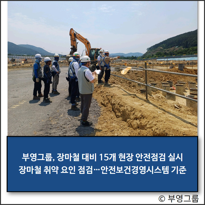 부영그룹이 안전한 작업현장 조성을 위한 장마철 대비 안전점검을 실시한다. 이번 점검은 이달 10일부터 17일까지 15개 현장에서 이뤄진다.